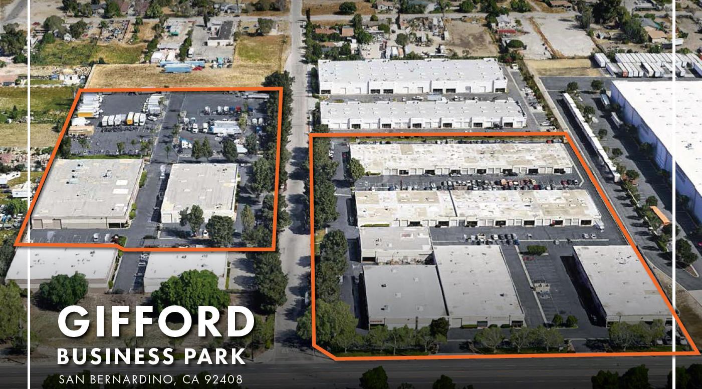 Gifford Business Park is an industrial property located in San Bernardino, California, covering a total area of 156,717 square feet on a 12.52-acre lot. This multi-tenant business park features industrial zoning, providing essential amenities such as 100-200 amps of power, a clear height of 14 to 16 feet, motion sensor LED lighting in the warehouse, and ground-level loading access. The facility has been designed to accommodate various industrial needs and operations efficiently.