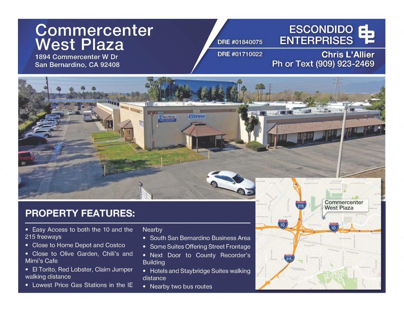 1894 Commercenter W is an industrial property situated in the San Bernardino Enterprise Zone, encompassing a total area of 34,704 square feet. This multi-tenant facility is designed to accommodate diverse business needs, featuring a professional image conducive to growth and success. The property includes warehouse and office configurations, with significant amenities such as three-phase power and roll-up doors of varying dimensions. The building also boasts 14-foot clear heights in the warehouse area and offers immediate access to the I-10 and I-215 freeways, enhancing connectivity to surrounding areas. The site provides parking for 69 vehicles and is in proximity to various restaurants and shops along Hospitality Drive. Available spaces include two suites, both measuring 1,580 square feet and designated for manufacturing use, featuring single-load warehouse configurations and one drive-in door each.